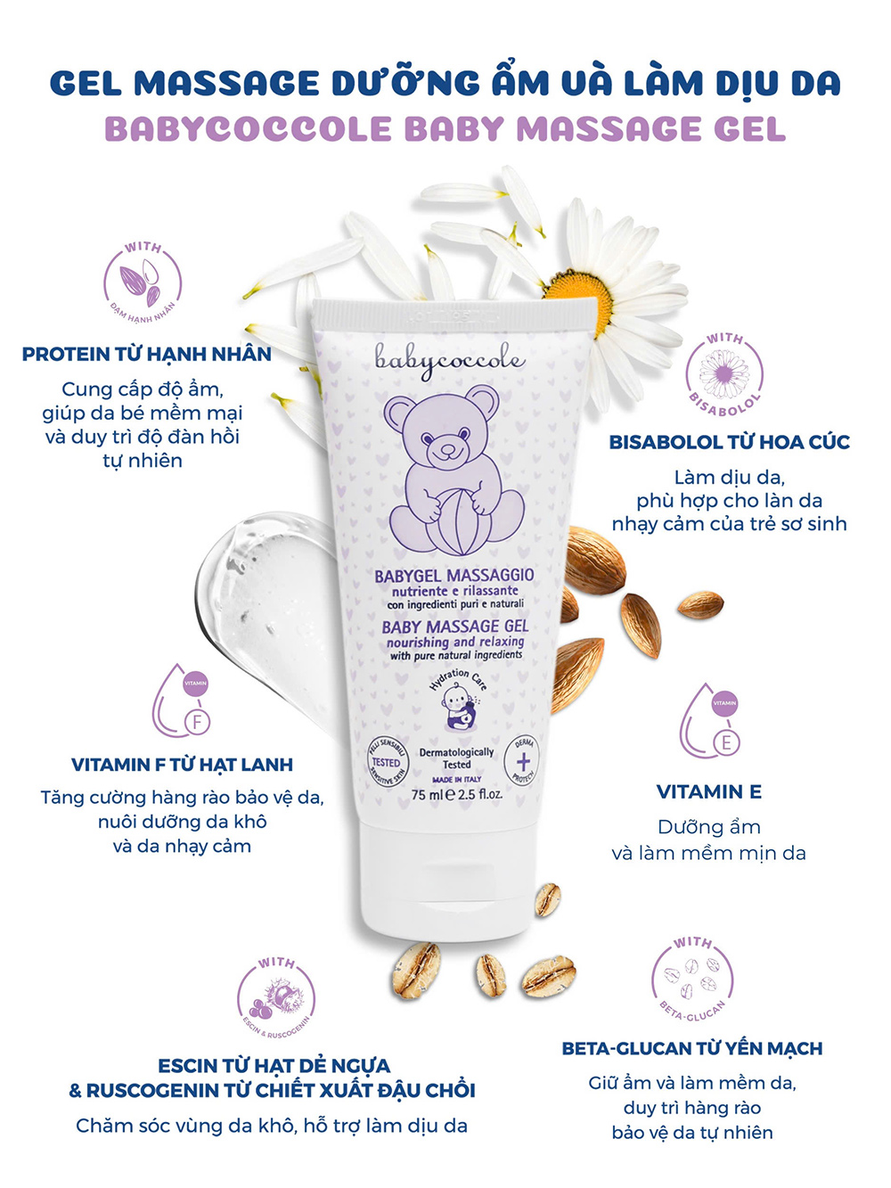 1. Gel massage Babycoccole giúp cho những giây phút vuốt ve, massage của mẹ thêm phần dịu êm, mềm mại. Hoạt động massage đã được chứng mình là sợi dây gắn kết giữa mẹ và bé, giúp kích thích sự tăng trưởng, xây dựng não bộ, tăng hệ miễn dịch và cho bé giấc ngủ sâu hơn.