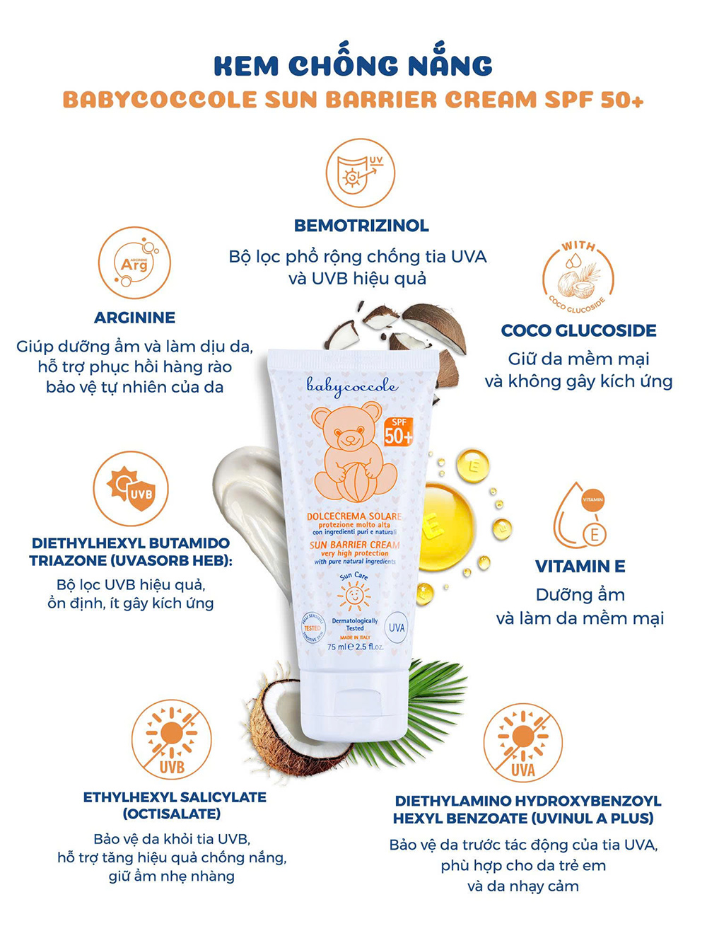 1. Kem chống nắng Babycoccole SPF 50+: Với chỉ số SPF 50+ lý tưởng giúp bảo vệ làn da nhạy cảm của bé khỏi tác hại của tia UVA & UVB, đồng thời dưỡng ẩm và làm dịu da nhẹ nhàng cho làn da của bé.