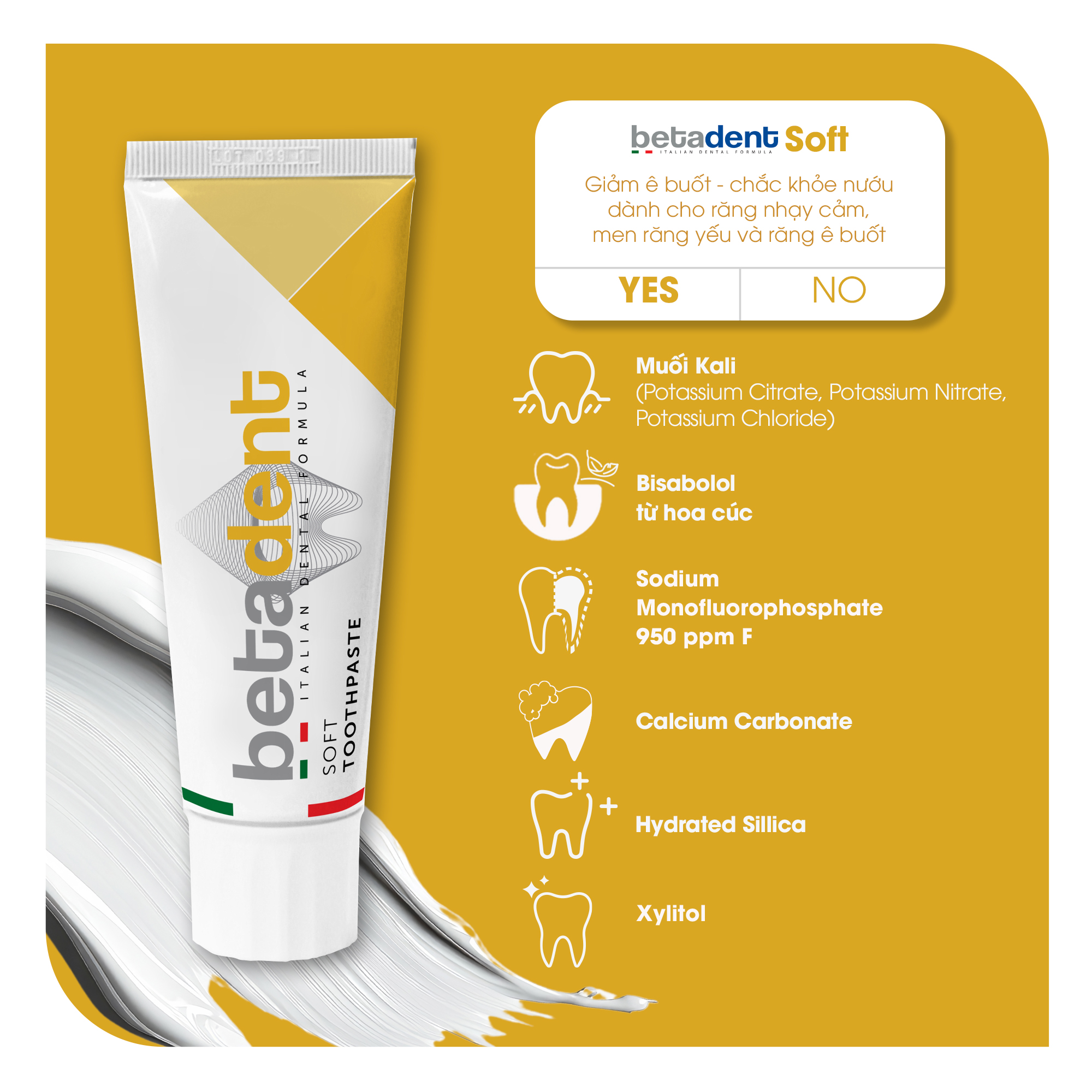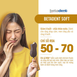 Kem đánh răng BETADENT SOFT được thiết kế dành riêng cho răng và nướu nhạy cảm, giúp làm sạch nhẹ nhàng và mang lại cảm giác dễ chịu khi sử dụng.