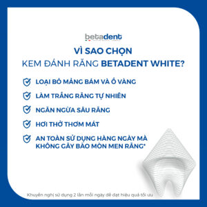Kết hợp kem đánh răng BETADENT WHITE kết hợp bàn chải BETADENT HARD để duy trì chế độ chăm sóc răng miệng toàn diện và nụ cười rạng rỡ.
