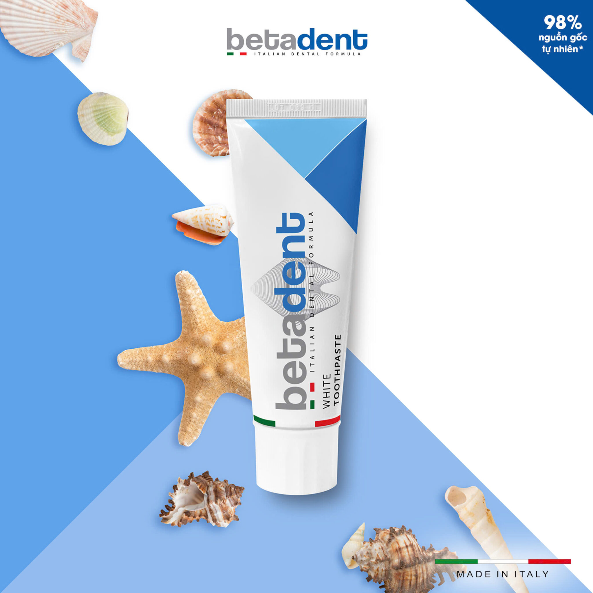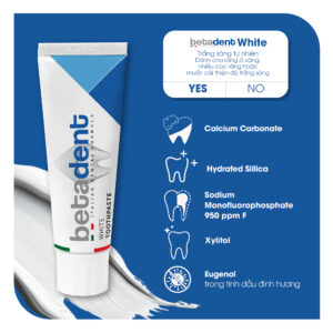 Kem đánh răng BETADENT WHITE hỗ trợ làm trắng răng tự nhiên nhờ công thức tiên tiến kết hợp Solum Diatomeae (đất tảo cát), silica vi mô và Sodium Monofluorophosphate. Sản phẩm nhẹ nhàng cải thiện tinh trạng mảng bám, vết ố vàng, mang lại hàm răng trắng sáng rạng rỡ như ngọc trai.