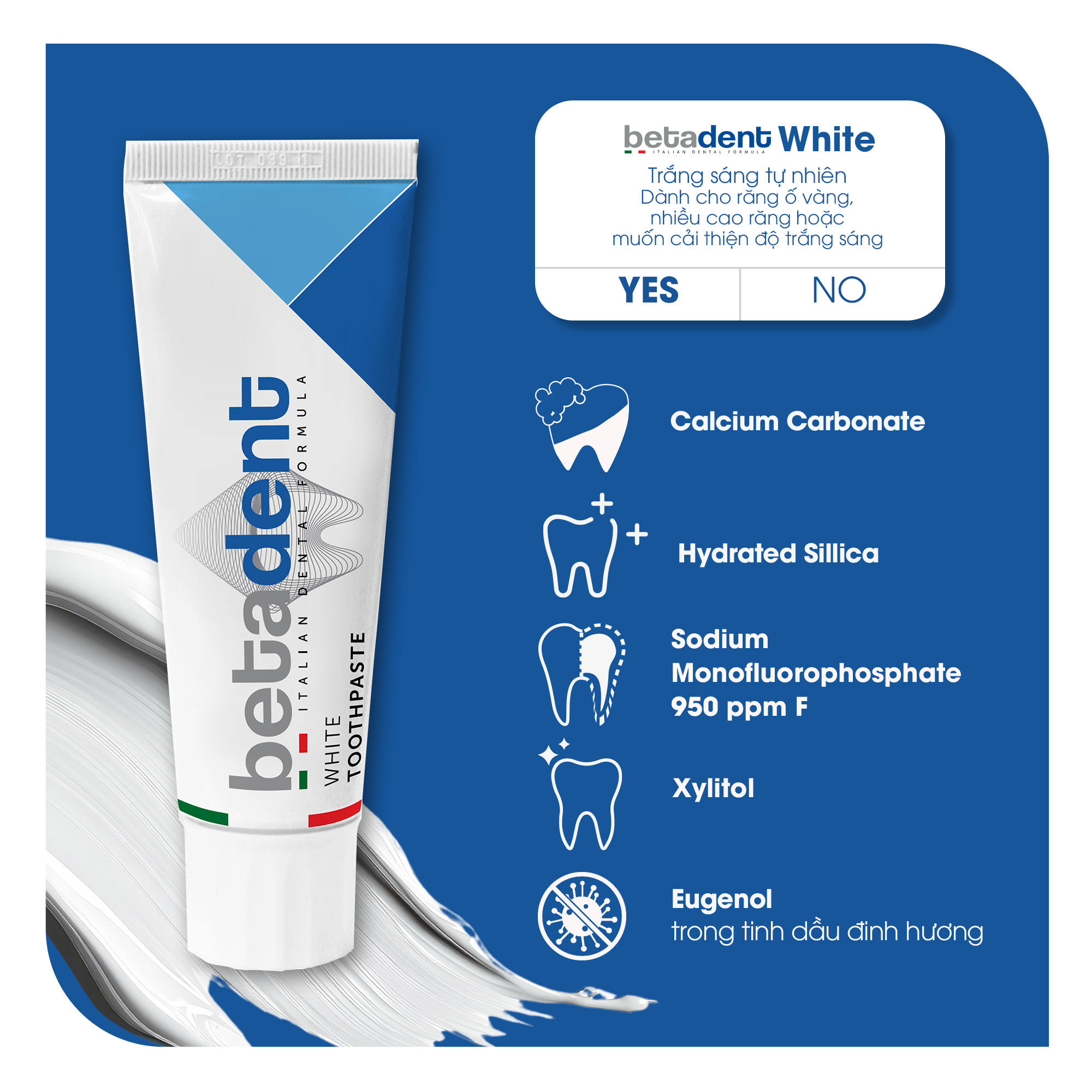 Công thức đặc biệt hỗ trợ tái khoáng hóa men răng, củng cố và bảo vệ độ chắc khỏe của răng. Đồng thời, kem đánh răng BETADENT WHITE mang đến hơi thở thơm mát dài lâu, giúp bạn tự tin suốt cả ngày.