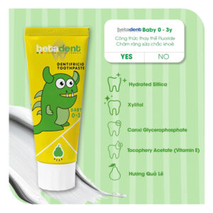 Kem đánh răng BETADENT BABY hương lê được thiết kế đặc biệt dành cho bé từ 0-3 tuổi, giúp làm sạch nhẹ nhàng, bảo vệ nướu nhạy cảm và củng cố men răng non nớt.