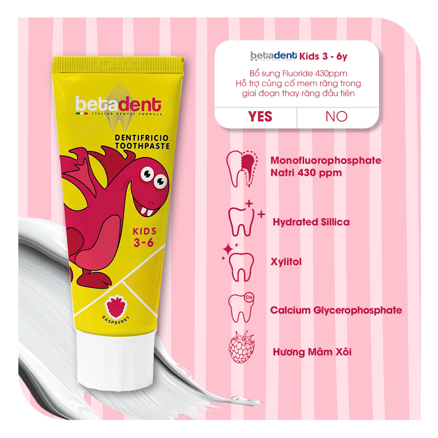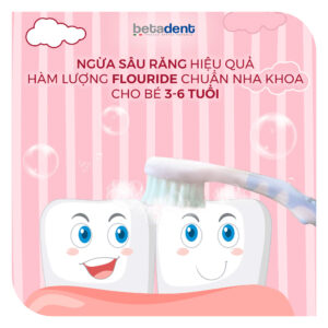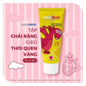 BETADENT KIDS hương mâm xôi – kem đánh răng dành cho trẻ từ 3 đến 6 tuổi, với hàm lượng Fluoride 430 ppm F an toàn và lý tưởng cho răng trẻ nhỏ. Sản phẩm giúp bảo vệ răng miệng toàn diện, hỗ trợ củng cố men răng và ngăn ngừa sâu răng hiệu quả.