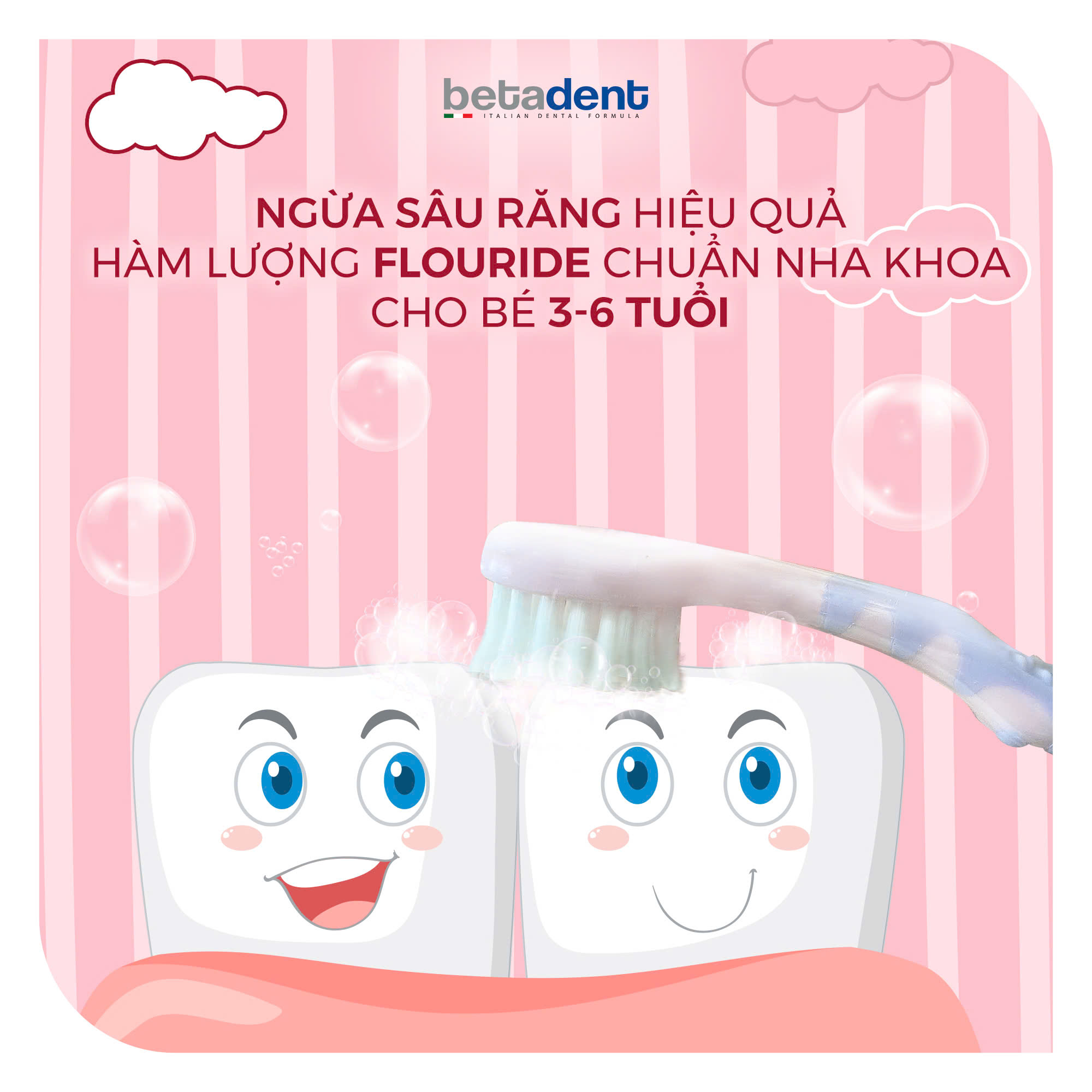 Kết hợp kem đánh răng BETADENT KIDS với bàn chải BETADENT hoặc bàn chải điện giúp duy trì chế độ chăm sóc răng miệng toàn diện và mang lại nụ cười rạng rỡ cho bé!