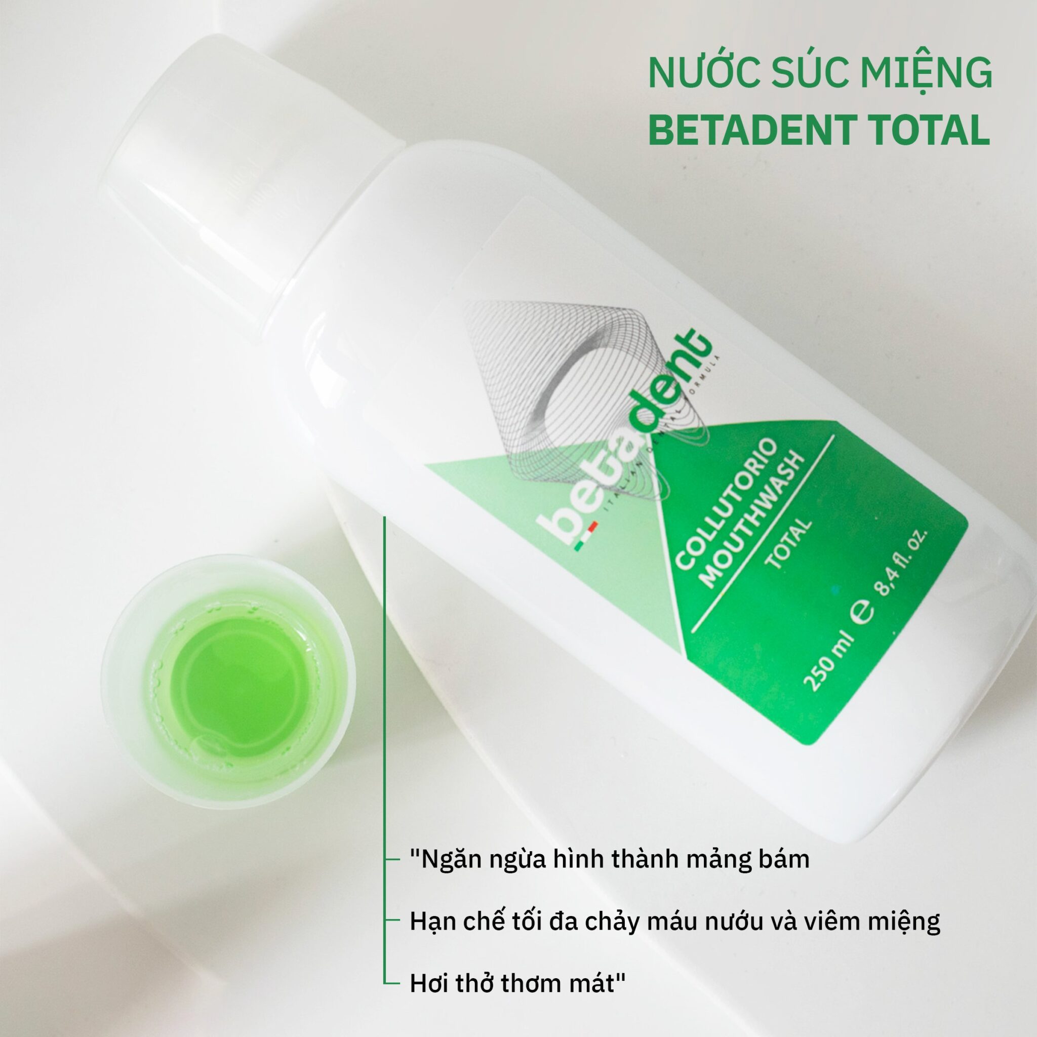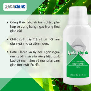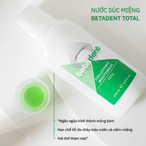 Nước súc miệng BETADENT TOTAL giúp chăm sóc khoang miệng toàn diện mỗi ngày. Sản phẩm chứa tinh chất bạc hà tự nhiên từ Ý mang đến cảm giác sảng khoái, thơm mát.
