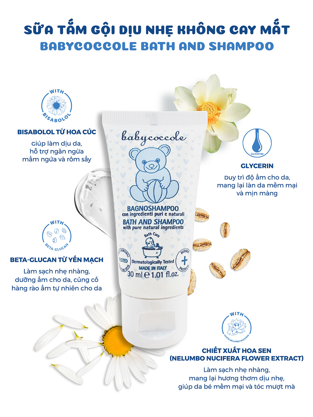 1. Làm sạch dịu nhẹ cho tóc và da bé: Bộ 3 chiết xuất hoa sen, hoa cúc và yến mạch giúp nhẹ nhàng làm sạch, đồng thời bảo vệ lớp màng ẩm tự nhiên trên làn da mỏng manh của bé. Sản phẩm cân bằng pH, làm dịu làn da, giúp da bé luôn mềm mại và khỏe mạnh. Hỗ trợ ngăn ngừa rôm sẩy và các kích ứng.