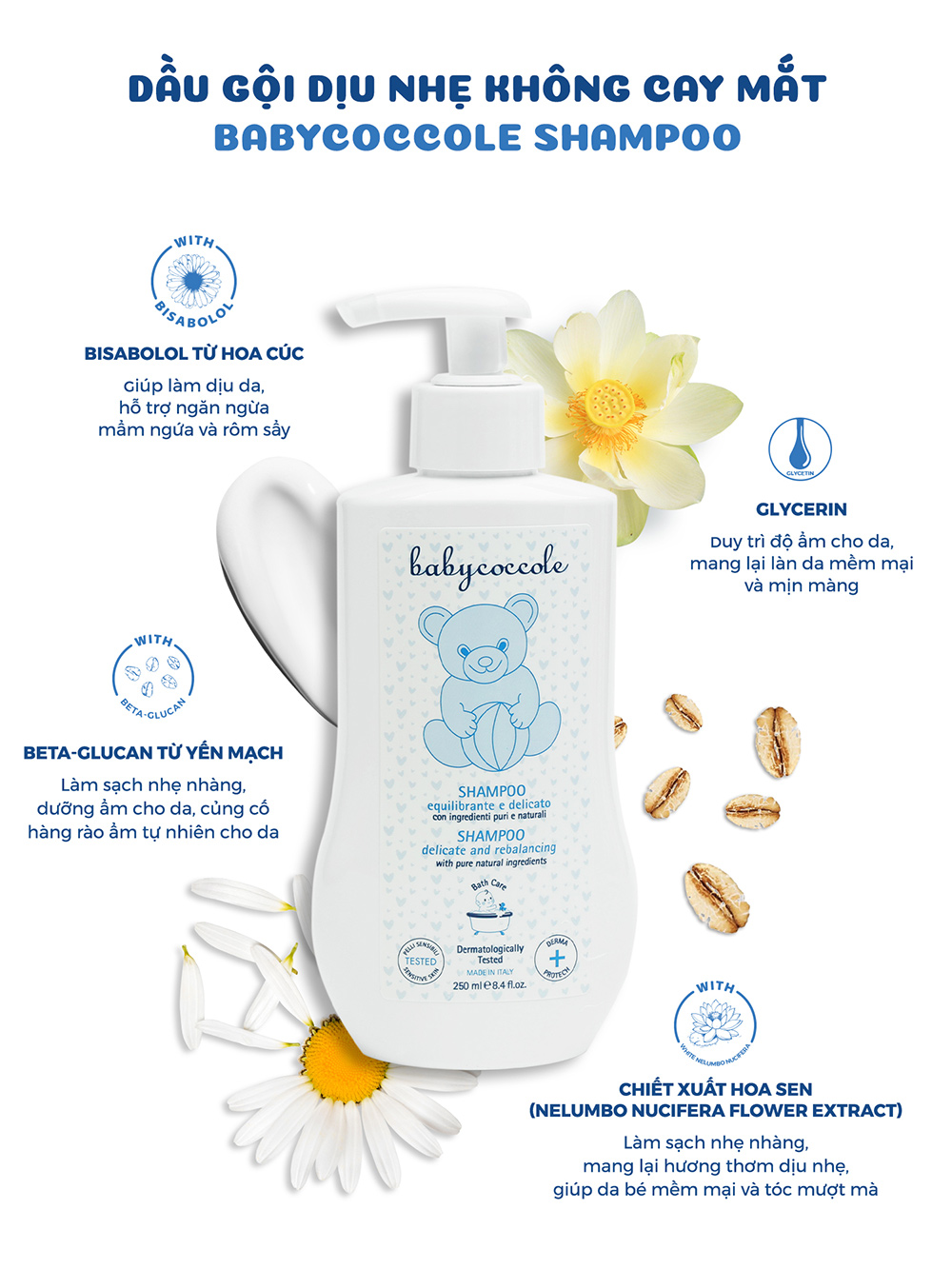 – Chiết xuất yến mạch, hoa cúc và hoa sen giúp làm sạch và dưỡng ẩm da bé